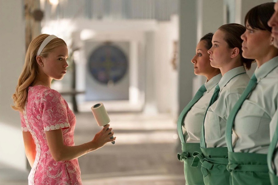 Si certains.es d’entre vous s’attendent à découvrir Julianne Moore en femme poisson, vous allez être déçus. Quoique. S’il n’y a effectivement pas de sirènes dans la série, la mise en scène offre tout de même un petit quelque chose d’enchanteur. En effet, les séquences revêtent quasi toujours des tonalités colorées et saturées, de la robe rose de Simone aux fleurs qui ornent le jardin des Kell. Seule Devon, toute de noir vêtu à son arrivée, détonne dans cet univers riche en couleurs et en flouze. Difficile de ne pas rapprocher Sirens de la série The White Lotus à la vue de ces plans tape-à-l’œil aux couleurs chatoyantes, ces personnages blindés dictés par le paraître et un personnel de maison bien plus enclin à la survie qu’à la vie, faute de choix.Pourtant, Molly Smith Metzler parvient à créer son identité propre et livre un récit plus sombre et caustique encore que la série anthologique de Mike White. S’amusant avec différentes strates d’humour, la showrunneuse nous balade de rires en malaises. Parsemée de gags qui fleurent bon le burlesque, la mise en scène foisonnante de Sirens oscille constamment entre des scènes pleines de démesure, d’extravagance, d’humour et de théâtralité, et d’autres bien plus intimistes, qui nous ferait presque croire à une esthétique « Sundance ». On est donc loin du pur produit Netflix, reconnaissable entre mille, qui manque souvent de mordant et appauvrit l’ensemble.Poupée de cire, poupée de son